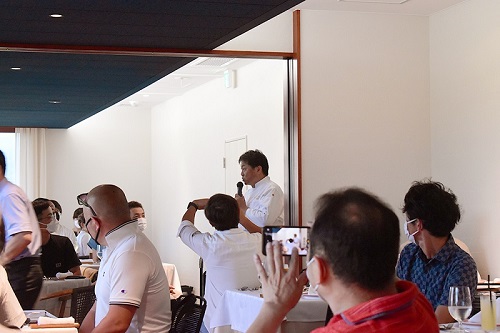 奥田シェフは兼ねてから普段お世話になっている生産者の方たちを招いた「生産者の会」を定期的に開いている。写真はインタビュー当日の夜、移転後の『アル・ケッチァーノ』にて初めて開催された「生産者の会」にて挨拶する奥田シェフ。生産者の方たちとの繋がりを大事にする奥田シェフらしい取り組み。